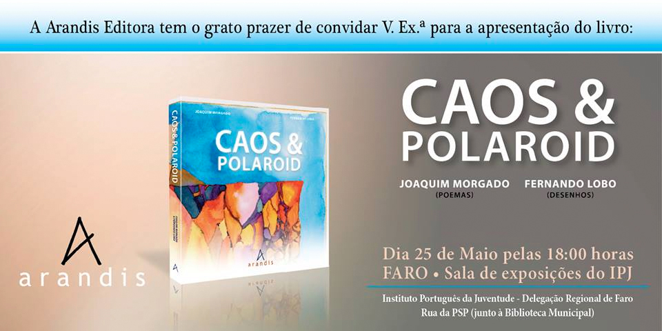 No próximo sábado, dia 25 de Maio, pelas 18 horas, no Instituto Português da Juventude, em Faro, será apresentado o livro "Caos & Polaroid", composto por poemas de Joaquim Morgado e ilustrações de Fernando Lobo, ambos farenses.