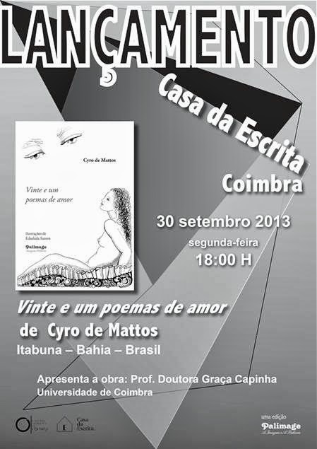 Lançamento de "Vinte e um poemas de amor" de Cyro de Mattos, na casa da Escrita. Rua Dr. João Jacinto nº8, Sé Nova - Coimbra.