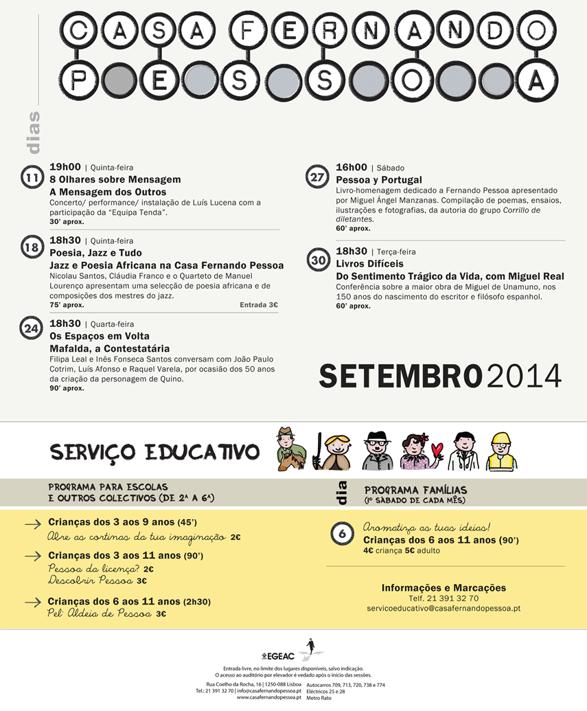 Participação dos poetas João Morgado, dia 2 , Jorge Castro, dia 9, Pires Laranjeira dia 16 e Maria Estela Guedes, Ricardo Gil Soeiro, José do Carmo Francisco, Luís Miguel Vendeirinho e Joana Ruas, dia 30.