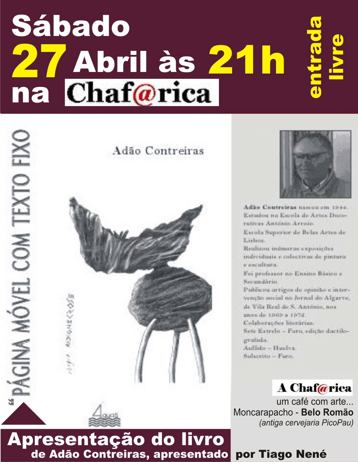 A partir das 20H00, a entrada é livre. Mas para o lançamento do livro, tem que se tirar bilhete à entrada – é grátis mas tem que ter bilhete (bilhete grátis).